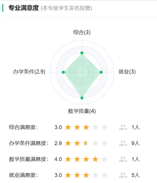实验艺术专业满意度反映了本专业学生对专业的满意程度,下面分别从专业综合满意度、专业办学条件满意度、专业教学质量满意度、专业就业前景满意度四个方面为大家做了介绍。实验艺术专业综合满意度为3.0颗星,办学条件满意度2.9颗星,教学质量满意度4.0颗星,就业前景满意度3.0颗星(6.0分)。详见下图: