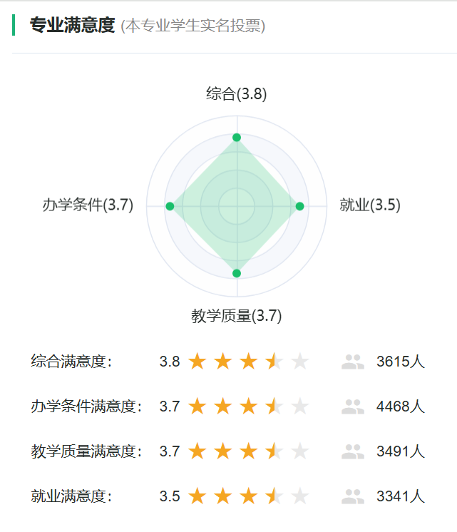 服装与服饰设计专业满意度反映了本专业学生对专业的满意程度,下面分别从专业综合满意度、专业办学条件满意度、专业教学质量满意度、专业就业前景满意度四个方面为大家做了介绍。服装与服饰设计专业综合满意度为3.8颗星,办学条件满意度3.7颗星,教学质量满意度3.7颗星,就业前景满意度3.5颗星(7.0分)。详见下图: