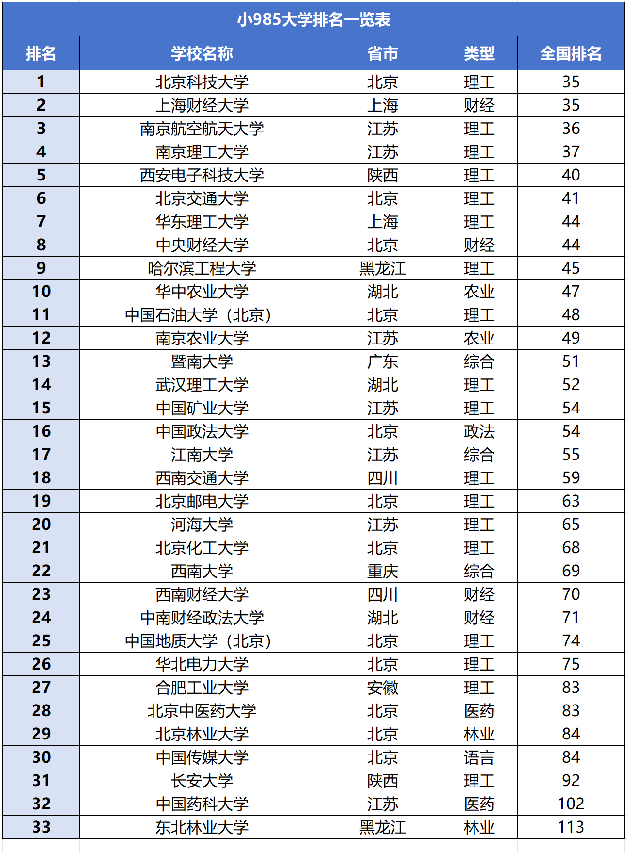 小 985 一般指 985 工程优势学科创新平台,这些高校的层次在 985 和一般的 211 高校之间,被戏称为 984.5。它们基本上是没有经历过合并重组的行业特色型大学,学科精度很纯,拥有一至两个全国顶尖的学科,具有深厚的行业底蕴和学科积淀,在行业内认可度极高。